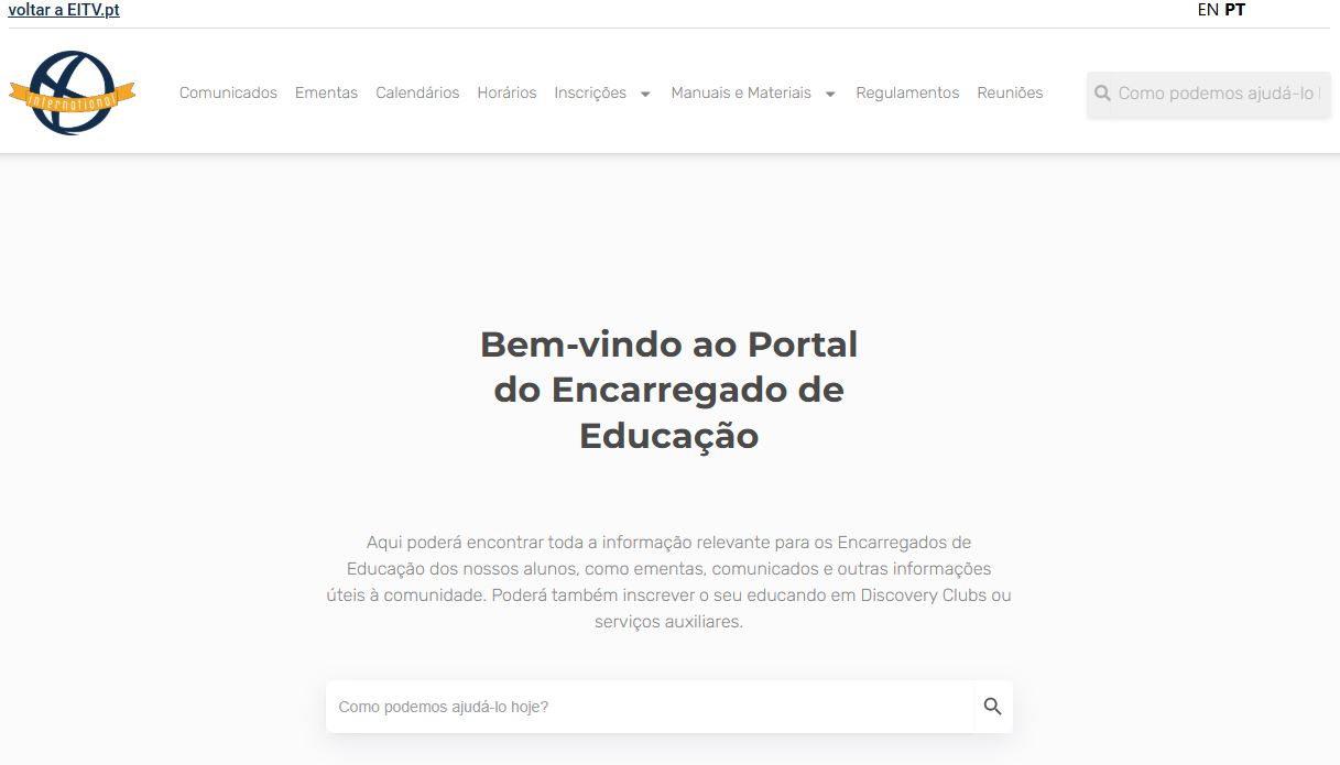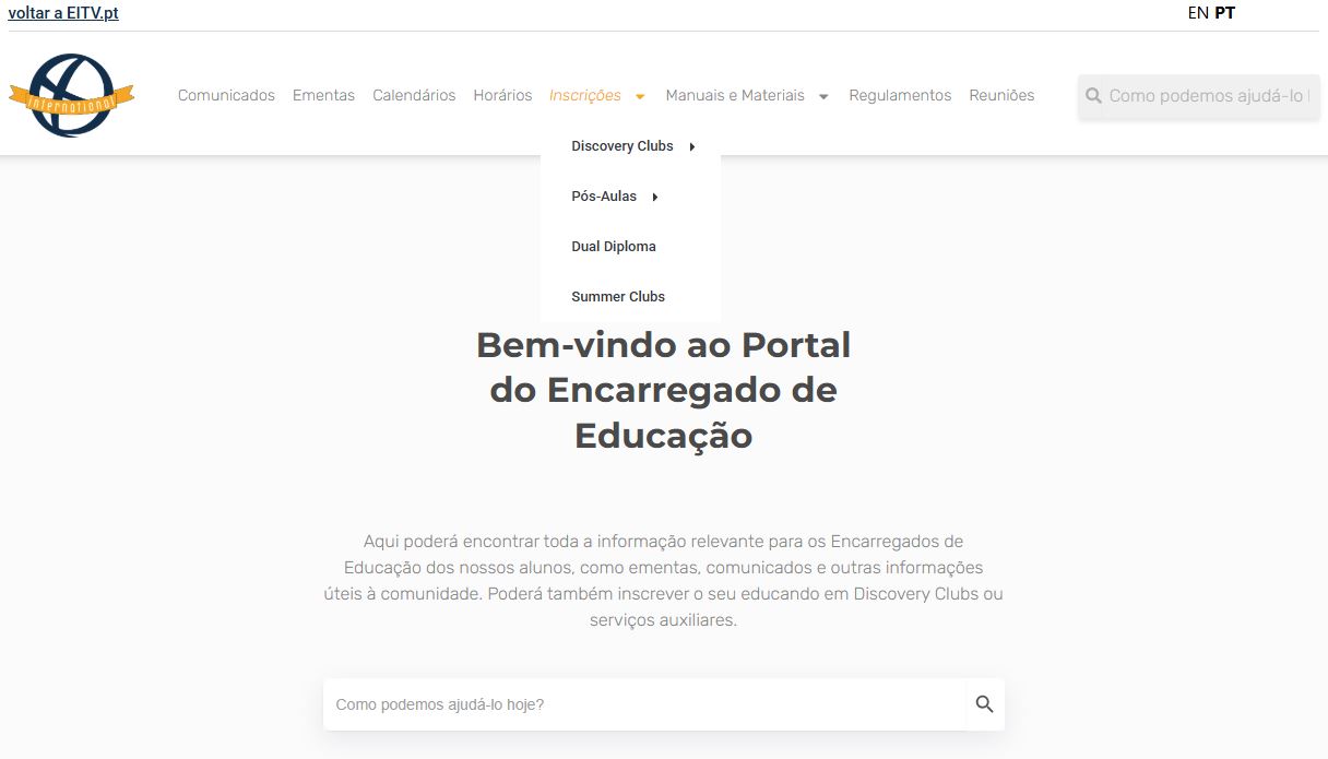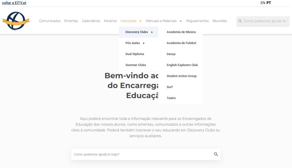 Para inscrever o seu educando nos Discovery Clubs disponíveis na EITV, pode aceder ao nosso Portal EITV, em portal.eitv.pt e navegar pelo menu superior tal como demonstrado abaixo: