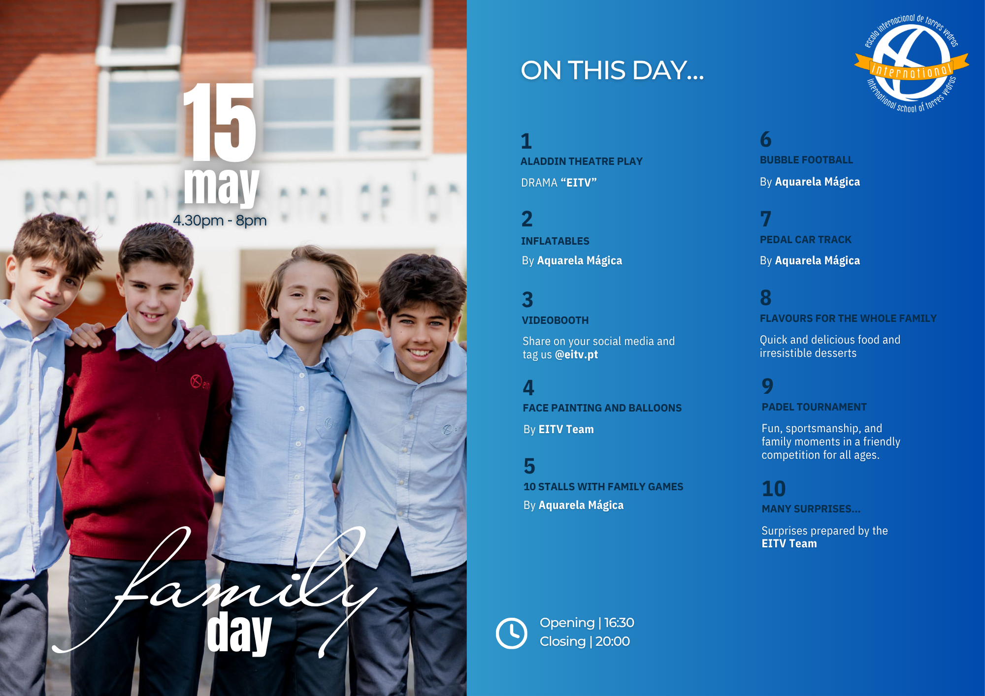 We are delighted to invite you to the EITV Family Afternoon, which will take place on May 15th 2026 (16h30 – 20h00) at Escola Internacional de Torres Vedras.